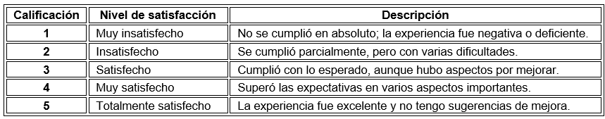 A continuación, califique de 1 a 5 su nivel de satisfacción respecto a los siguientes aspectos: